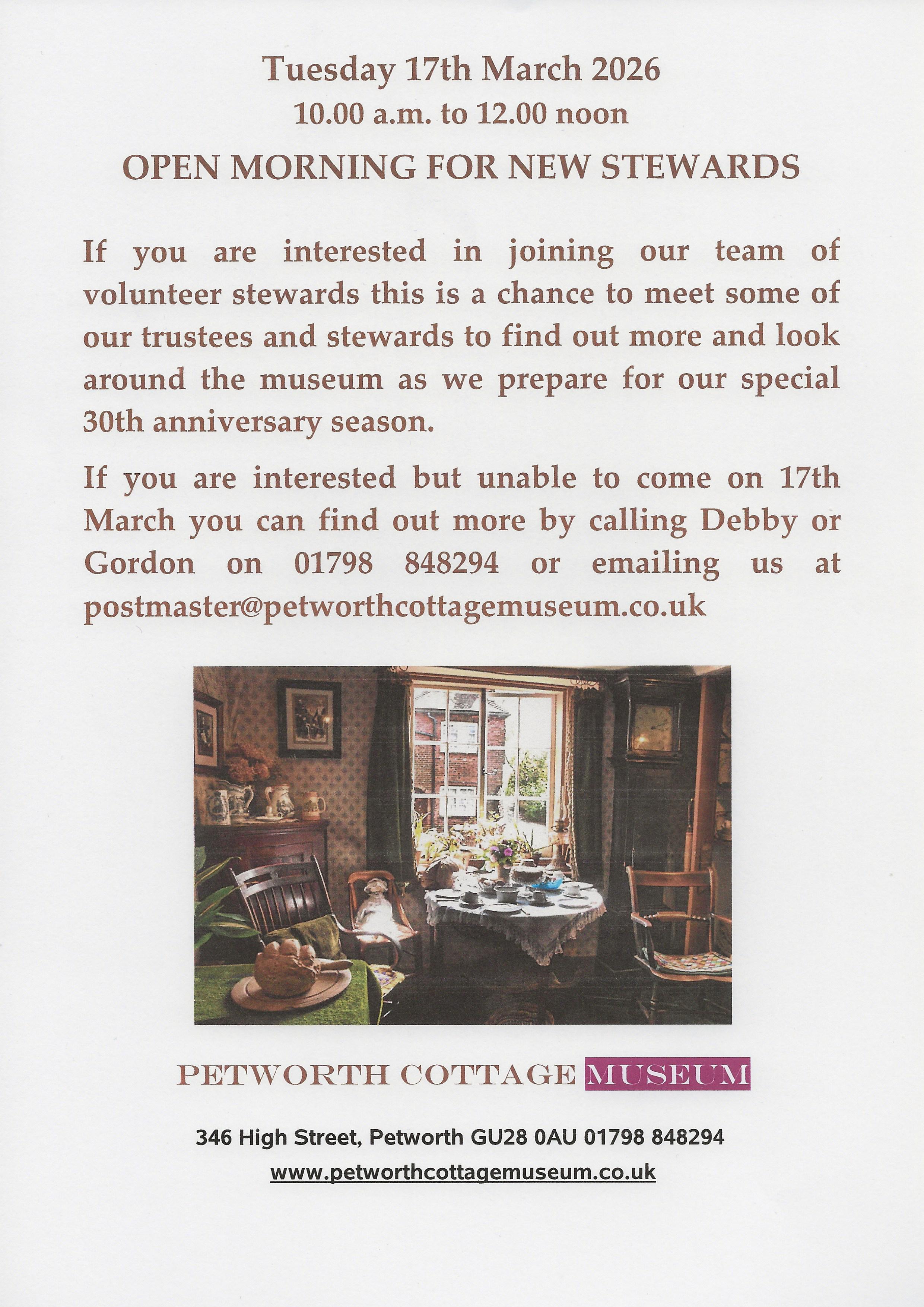 On Tuesday 17th March 2026 from 10.00 a.m. to 12.00 noon the museum will be open for anyone interested in joining our team of volunteer stewards. Meet some of our trustees and stewards. Find out more about stewarding. Look around the museum as we prepare for our 30th anniversary season. Click on the poster on the left for more details. Petworth Heritage Weekend