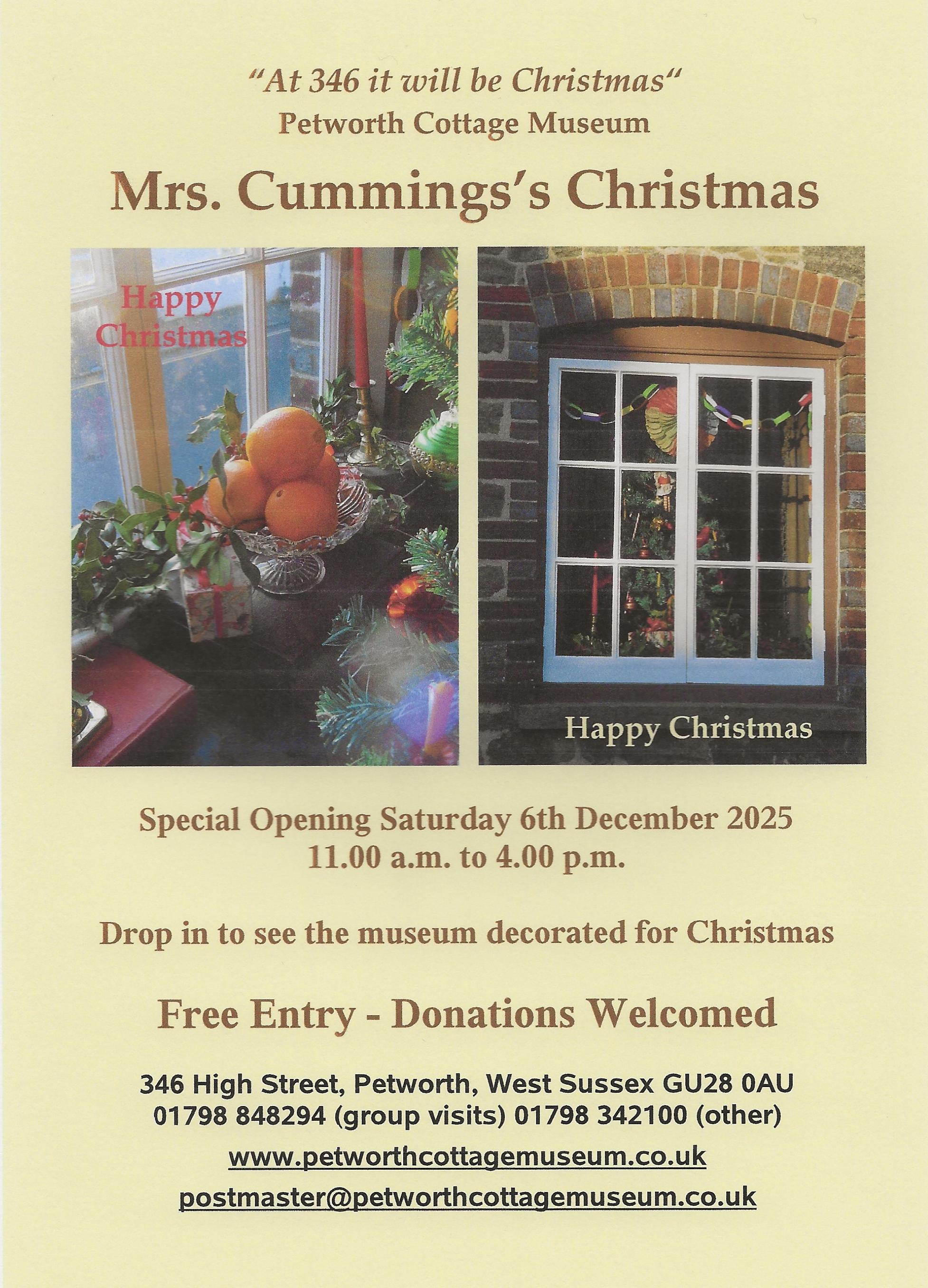 Petworth Cottage MuseumChristmas Opening 2025On Saturday 6th December 2025 the ground floor only of the museum will be decorated for Christmas and will open from 11.00 a.m. to 4.00 p.m. Admission is free but donations are welcome.